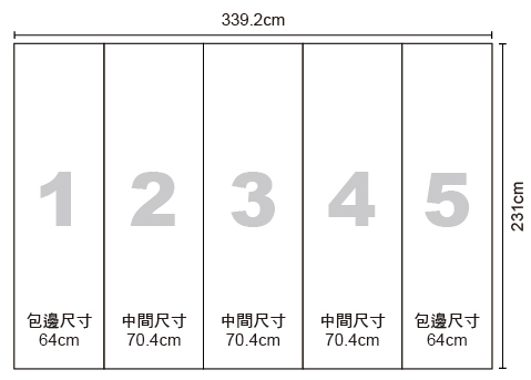 - 共五片組合,設計時請注意左右弧面,請勿將logo、文字等重要資料設計於此